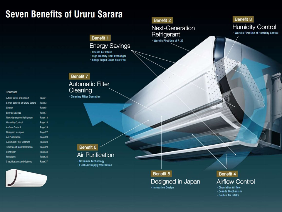 Най-висок клас на енергийна ефективност. Първият в света климатик работещ с фреон R-32. Единственият в света климатик контролиращ влажността . Прецизно насочване на въздушния поток. Мощен и съшевременно изключително тих. Проектиран и произведен в Япония. Пречистване на въздуха с технологията Streamer. Прахово самопочистване на филтъра.